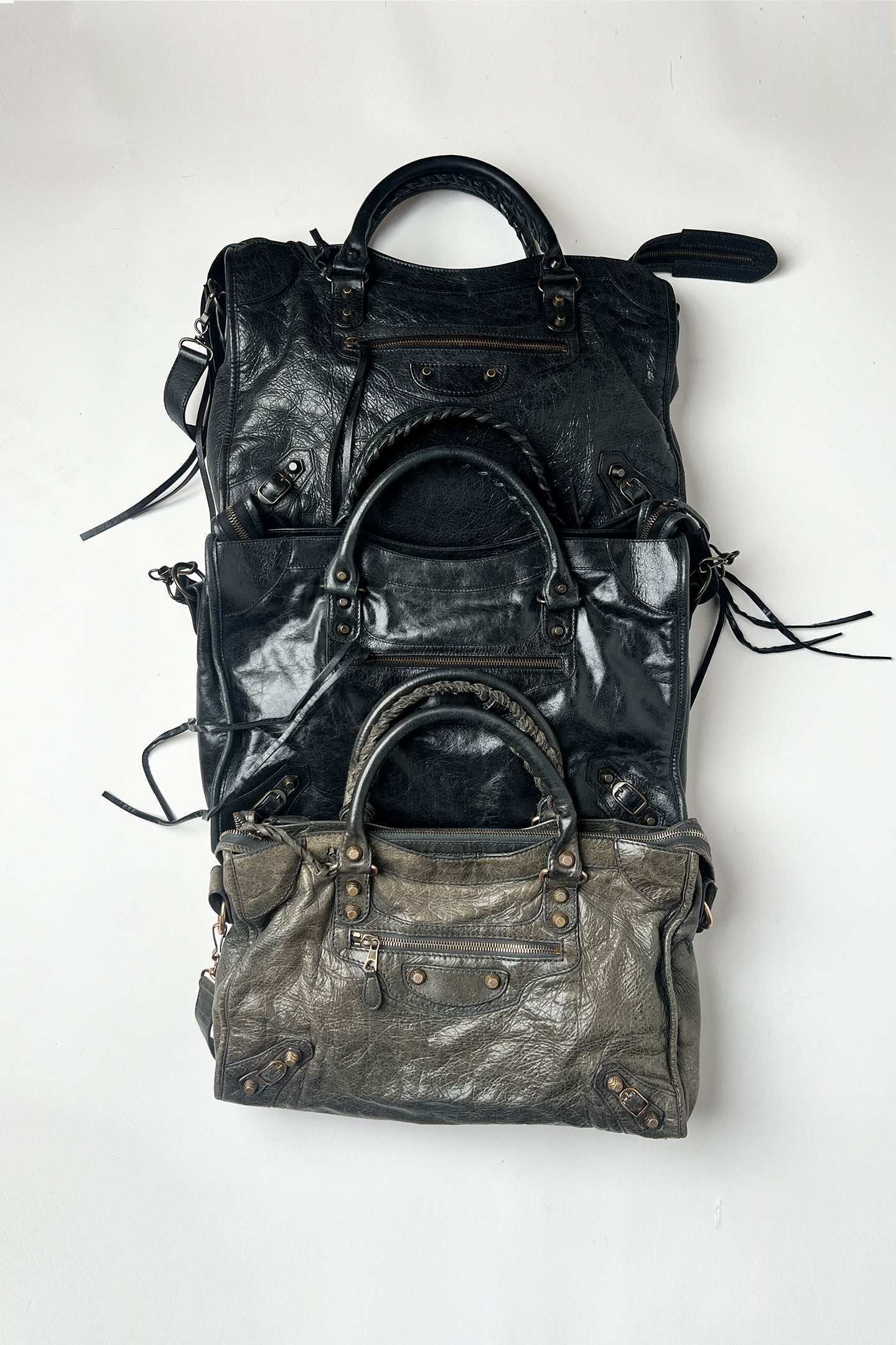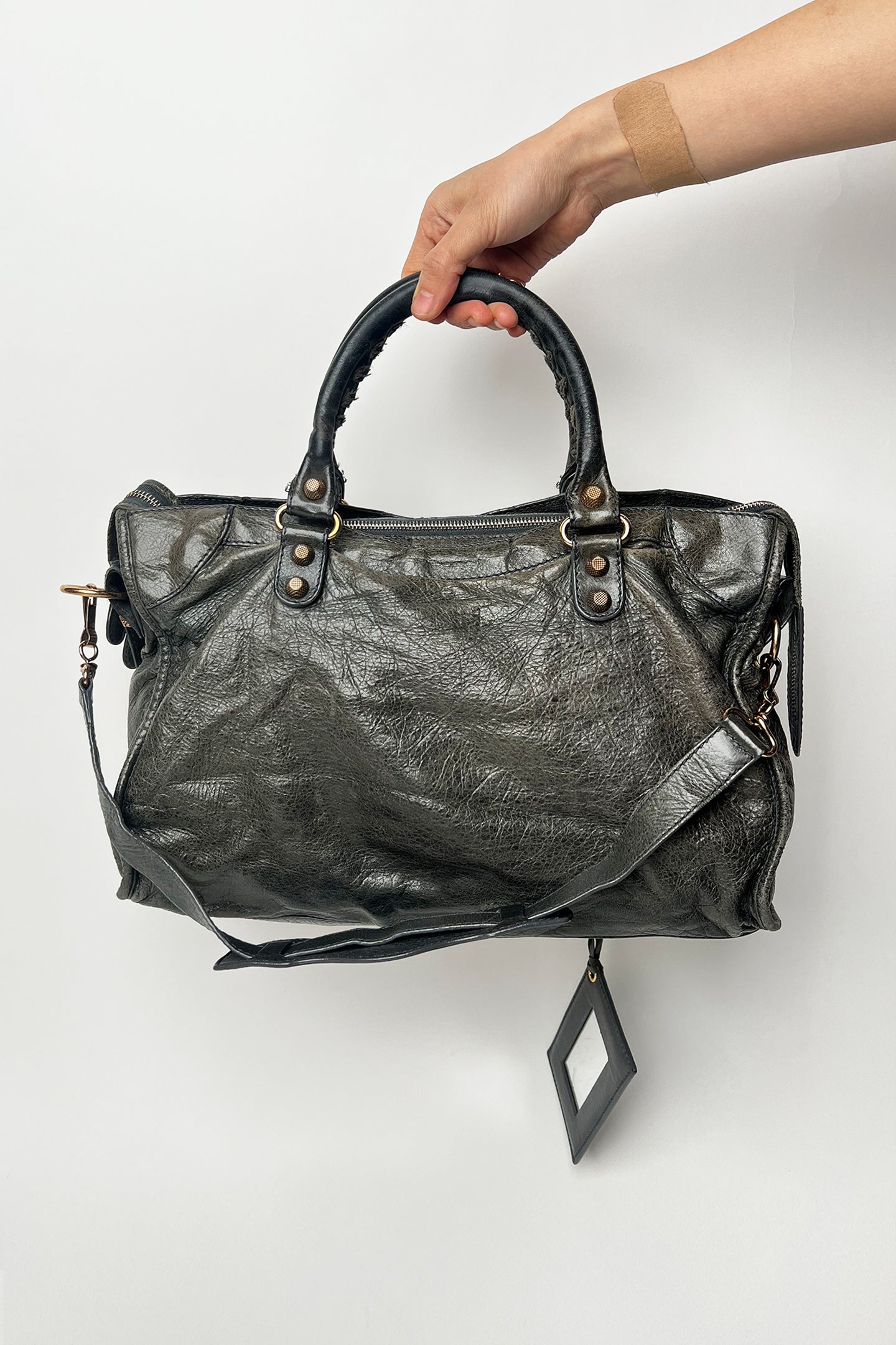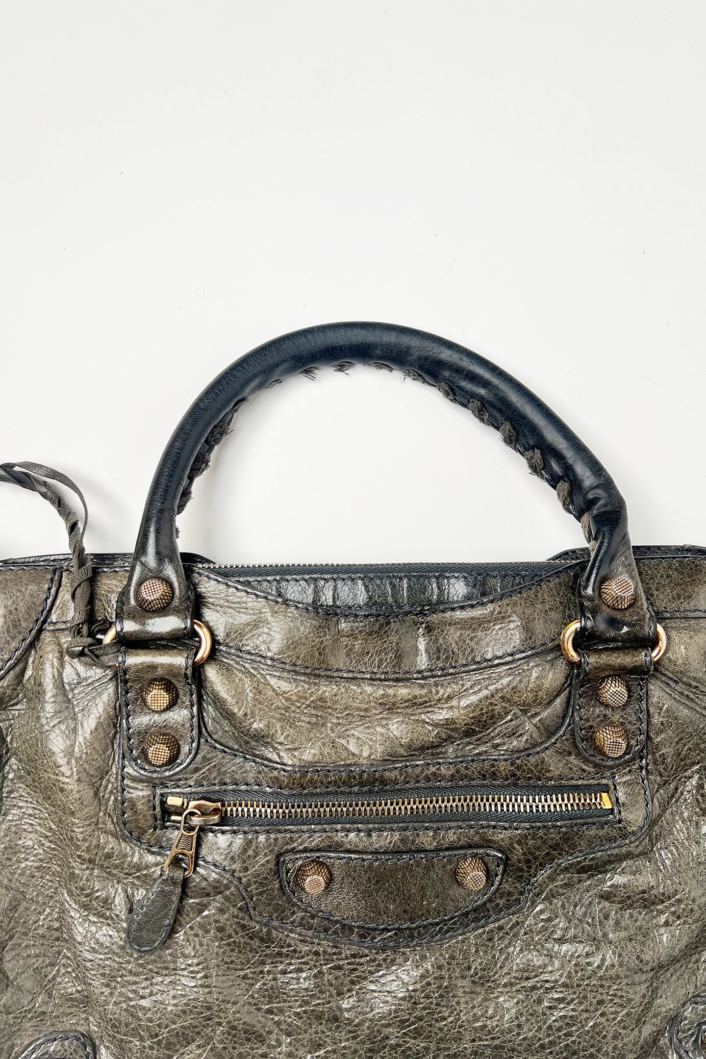 Vintage 2000s Balenciaga le city bag in distressed grey leather and giant rose gold hardware